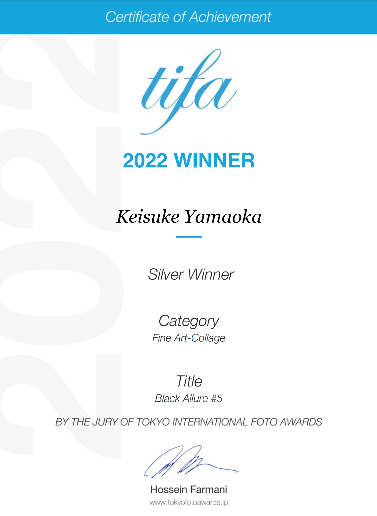 IPA(国際写真賞)から派生したTIFA:Tokyo International Foto Award 2022にて、作品【BLACK ALLURE#5】が銀賞を受賞いたしました。