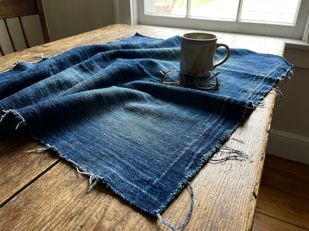 - 縦糸/横糸の色: 縦糸に色糸(インディゴなど)、横糸に生成りを使用。